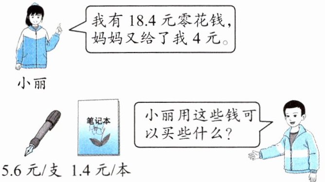 小丽原本有$18.4$元零花钱,妈妈又给了$4$元,那么总钱数$a = 18.4 + 4=22.4$元。