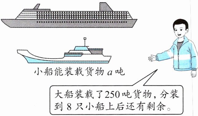3. 因为分装到$8$只小船上后还有剩余,所以$8a\lt250$,即$a\lt\frac{250}{8}=31.25$,又因为$a$表示货物重量,$a\gt0$,所以式子中的字母$a$可以是大于$0$且小于$31.25$的数。