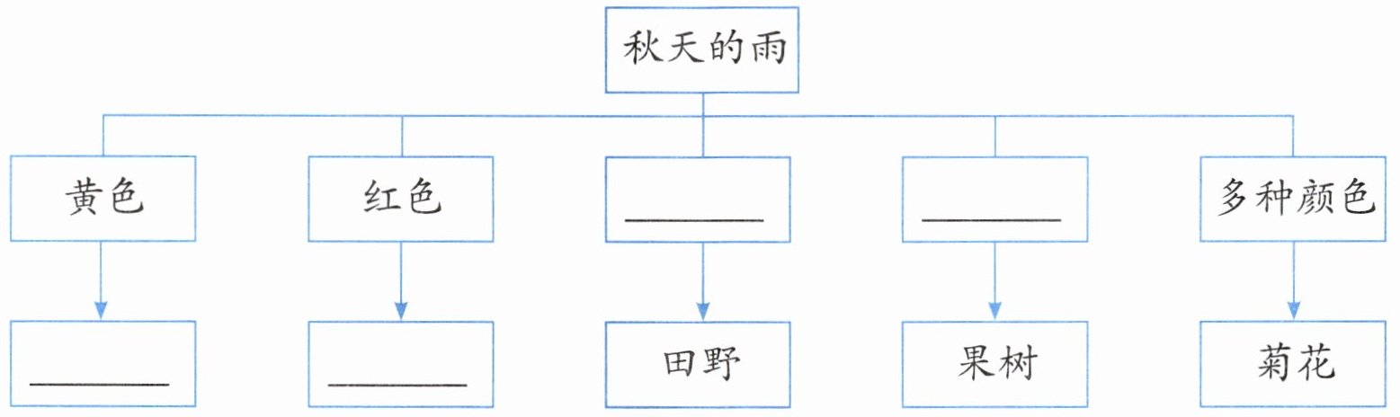)2. 秋天的雨把不同的颜料分别给了谁呢?请根据选段完成思维导图。