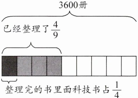 <题目>学校图书室共有图书 3600 册,已经整理了$\frac{4}{9}$,整理完的书里面科技书占$\frac{1}{4}$,已经整理了多少册科技书?