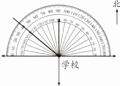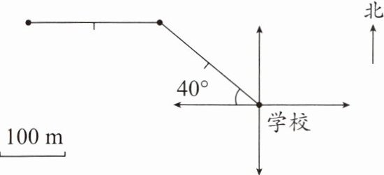 1. 在图上画出小明从学校出发向西偏北 $40^{\circ}$ 方向走 $200$ m。