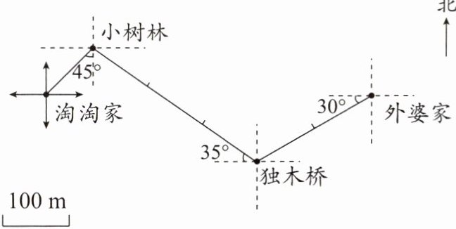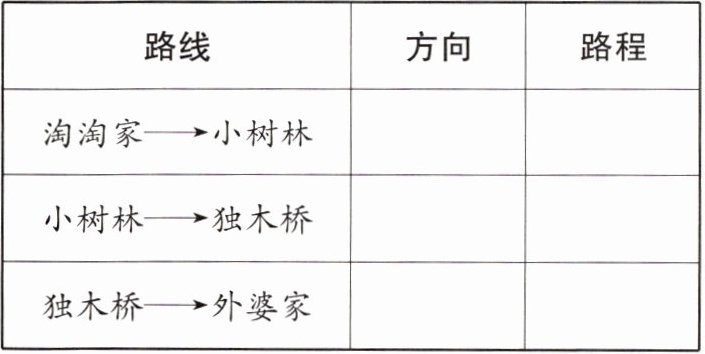 根据给出的路线图,说一说淘淘去外婆家所走的方向和路程,并完成表格。