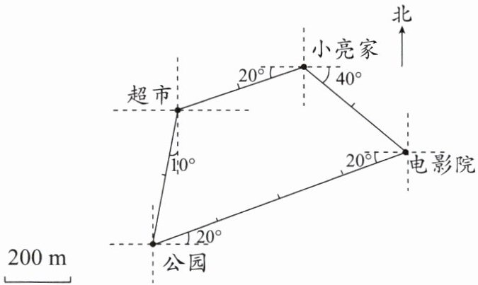 1200m到县政府,最后向西偏北20°方向走600m到书店。