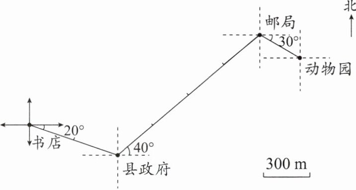 乐乐从动物园出发,先向西偏北30°方向行走300m到达邮局,再向西偏南40°方向行走1200m到达县政府,最后向西偏北20°方向行走600m到达书店。