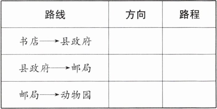 (1) 说一说乐乐从书店到动物园所走的方向和路程,完成下表。