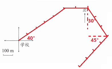 2. 从学校出发先向东偏北 $40^{\circ}$ 方向行进 $500m$,再向东行进 $200m$,接着向南偏东 $30^{\circ}$ 方向行进 $300m$,最后向西偏南 $45^{\circ}$ 方向行进 $400m$ 到达指定地点。根据描述,请把同学们军训的行军路线图画出来。