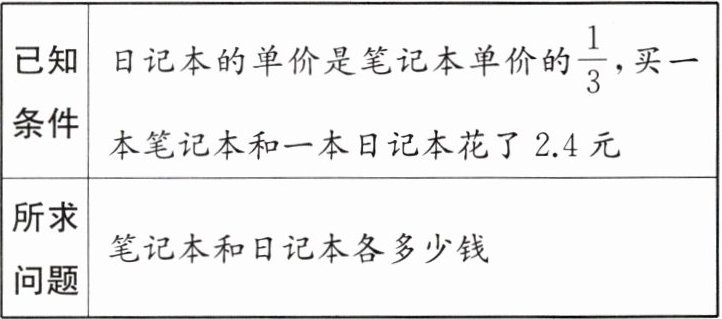 |已知条件|日记本的单价是笔记本单价的$\frac{1}{3}$,买一本笔记本和一本日记本花了$2.4$元|