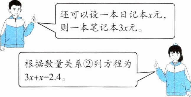 - 由一本笔记本和一本日记本花了$2.4$元可得:$(笔记本单价)+(日记本单价)=2.4$ ②