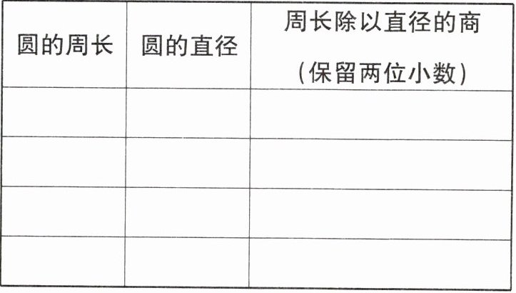 (2) 准备几个大小不同的圆,分别测量它们的直径和周长,把结果填入下表。