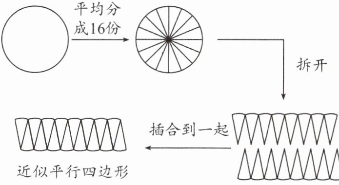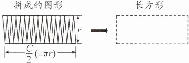 (2) 拼成的近似长方形与圆的周长、半径有什么关系?