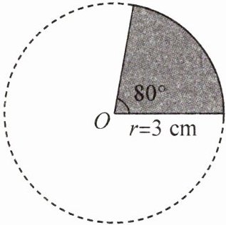 @@1. 画圆步骤:将圆规两脚间距确定为$3cm$,固定圆规带有针尖的一脚在纸上作为圆心$O$,旋转圆规另一脚画圆。2. 画圆心角步骤:用量角器,将量角器中心与圆心$O$重合,量角器$0^{\circ}$刻度线与圆的一条半径重合。在量角器$80^{\circ}$刻度处点一个点,过圆心$O$和这个点画射线,即得到$80^{\circ}$的圆心角。3. 完善扇形步骤:在半径上标出长度$r = 3cm$,在圆心角处标出度数$80^{\circ}$。将圆心角所对应的扇形区域涂上阴影。用橡皮擦去圆中除扇形两半径和弧之外多余的曲线。