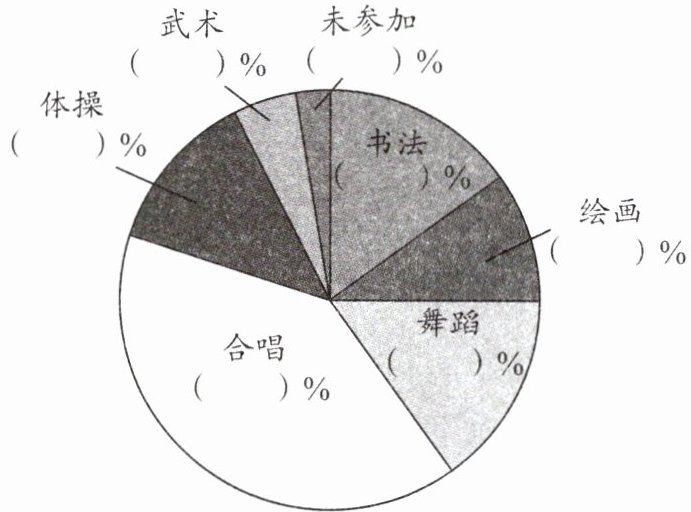 2. 书法:$30÷200×100\% = 15\%$;绘画:$20÷200×100\% = 10\%$;舞蹈:$30÷200×100\% = 15\%$;合唱:$80÷200×100\% = 40\%$;体操:$25÷200×100\% = 12.5\%$;武术:$10÷200×100\% = 5\%$;未参加:$5÷200×100\% = 2.5\%$