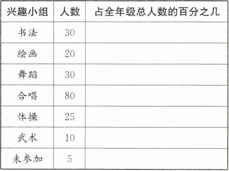 2. 你能计算出参加各兴趣小组的人数占全年级总人数的百分比吗?填在上表中。