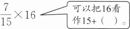解:$\frac{7}{15}×(15 + 1) = \frac{7}{15}×15 + \frac{7}{15}×1 = 7 + \frac{7}{15} = 7\frac{7}{15}$