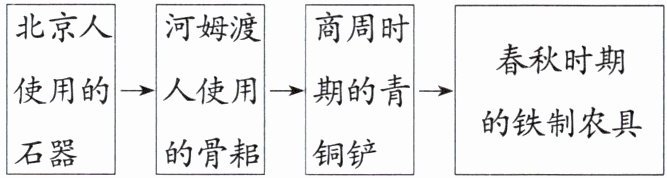 |北京人使用的石器|→|河姆渡人使用的骨耜|→|商周时期的青铜铲|→|春秋时期的铁制农具|