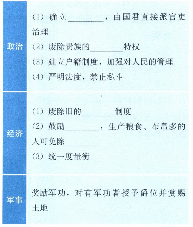 4. 影响:变法使秦国的政治、经济、文化、社会生活面貌有了根本的改变,综合国力大为增强,提高了军队战斗力,一跃而成为最强盛的诸侯国,为以后
