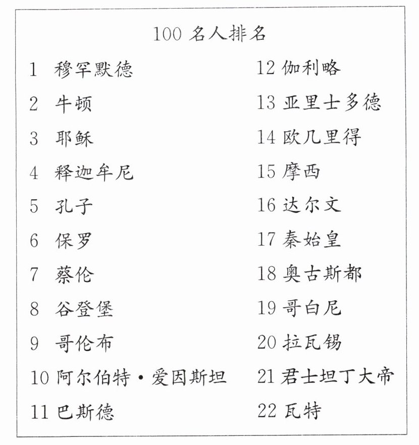 美国作家麦克·哈特所著《影响人类历史进程的100名人排行榜》目录(节选)
