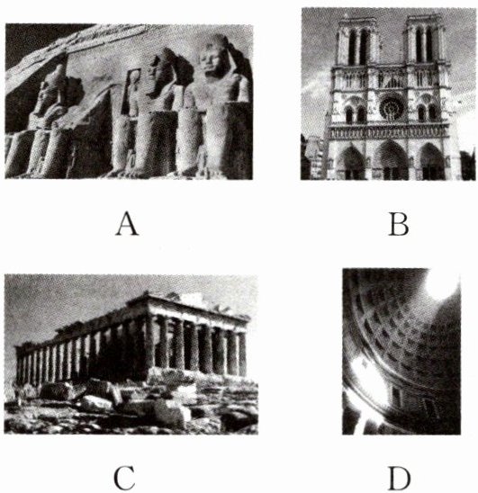 2. 希腊、罗马的建筑艺术对后世的建筑风格产生了深远影响,希腊建筑艺术主要体现在神庙。神庙四周以廊柱环绕,柱身有粗有细。下列图片为帕特农神庙的是( )