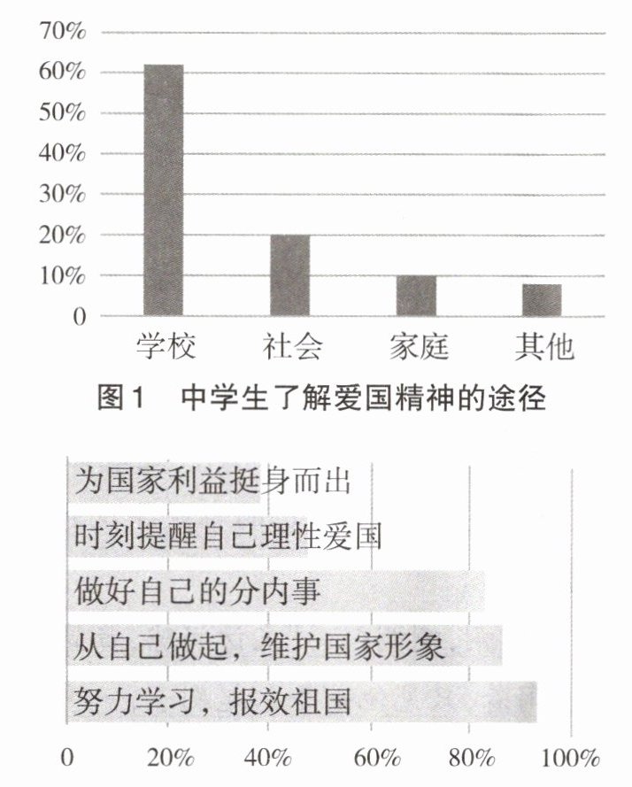 结论:中学生了解爱国精神的途径主要是学校,其次是社会,家庭和其他途径相对较少;在发扬爱国精神的具体做法上,“努力学习,报效祖国”和“从自己做起,维护国家形象”得到较多认同。