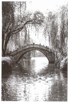 这是一座石拱桥,桥身呈弧形,横跨水面。桥两侧有护栏,岸边柳树垂拂,桥影倒映水中,造型优美,古朴典雅。
