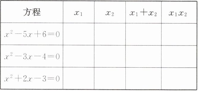 2. 上述表格中的三个方程的二次项系数的共同特点是什么?$x_1 + x_2和x_1x_2$与方程的系数之间有什么关系?