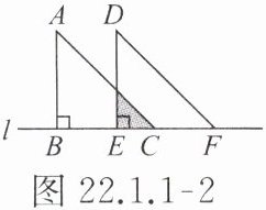 8. 如图 22.1.1-2,$ \triangle ABC $ 和 $ \triangle DEF $ 是全等的等腰直角三角形,$ \angle ABC = \angle DEF = 90^{\circ} $,$ AB = 4 $ cm,$ BC $ 与 $ EF $ 在直线 $ l $ 上,开始时点 $ C $ 与点 $ E $ 重合,让 $ \triangle ABC $ 沿直线 $ l $ 向右平移,直到点 $ B $ 与点 $ E $ 重合为止,设 $ \triangle ABC $ 与 $ \triangle DEF $ 的重叠部分(即图中阴影部分)的面积为 $ y $ $ cm^{2} $,$ CE $ 的长度为 $ x $ cm,则 $ y $ 与 $ x $ 之间的函数解析式为