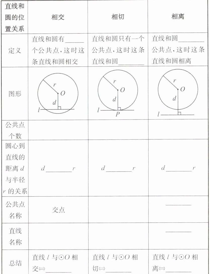 3. 如图24.2.2 - 1,⊙O的半径为r,圆心O到直线l的距离为d,观察图形并填空: