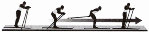 (1) 双杖推撑滑行时,在平地滑行,身体略前倾,左右脚雪板基本平行,双杖同时向后撑地,借助反作用力向前滑行,如此反复进行。