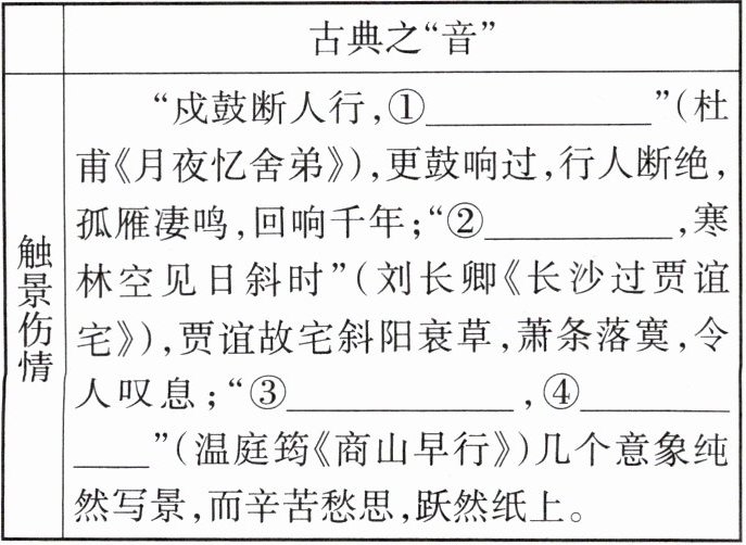 ”(温庭筠《商山早行》)几个意象纯然写景,而辛苦愁思,跃然纸上。||续表|