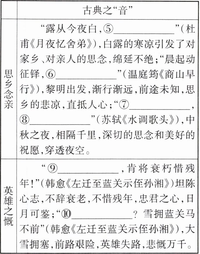 ”(温庭筠《商山早行》),黎明出发,渐行渐远,前途未知,思乡的悲凉,直抵人心;“⑦但愿人长久