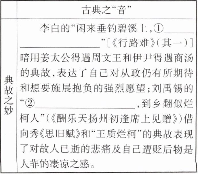 ”[《行路难》(其一)]暗用姜太公得遇周文王和伊尹得遇商汤的典故,表达了自己对从政仍有所期待和想要施展抱负的强烈愿望;刘禹锡的“②怀旧空吟闻笛赋