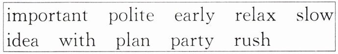 1. ideas 2. relaxed 3. rush 4. slowly 5. with 6. plans 7. important 8. party 9. early 10. impolite