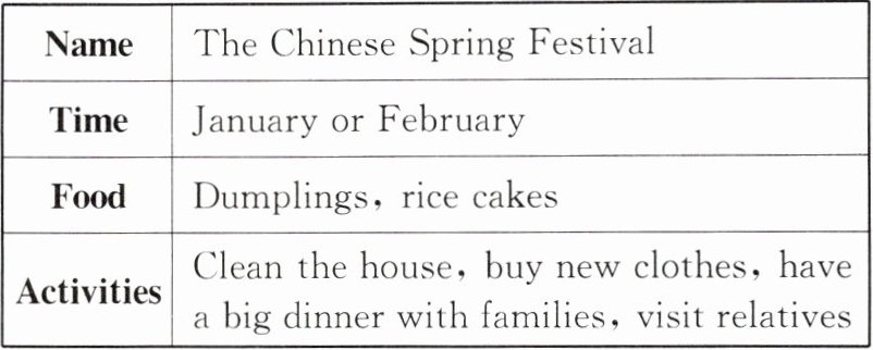 根据下面的表格提示,以“The Chinese Spring Festival”为题写一篇短文,介绍春节。