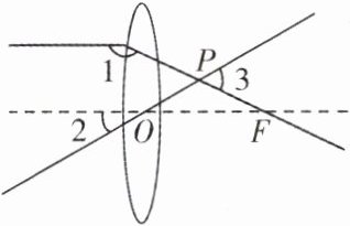 变式训练(跨学科融合)如图,一束平行于主光轴的光线经凸透镜折射后,其折射光线与一束经过光心 O 的光线相交于点 P,点 F 为凸透镜的焦点。若∠1 = 155°,∠2 = 30°,则∠3 的度数为(
