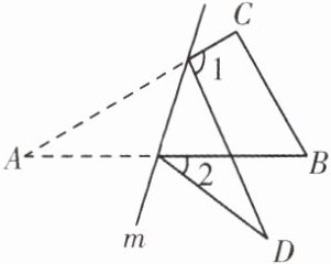 6. 如图,在△ABC 中,∠C = 90°,∠A = α,将△ABC 沿直线 m 翻折,点 A 落在点 D 的位置,求∠1 - ∠2 的度数。(用含α的式子表示)