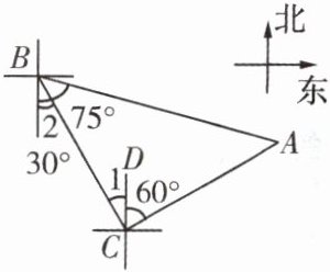 7. 如图,轮船从 B 处出发以每小时 50 海里的速度沿南偏东 30°方向匀速航行,在 B 处观测灯塔 A 位于南偏东 75°方向,轮船航行半小时到达 C 处,在 C 处观测灯塔 A 位于北偏东 60°方向,求∠A 的度数.