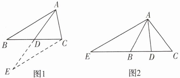 (2)如图 2,在$\triangle AEC$中,点$B$,$D在EC$上,$AE = 2AD$,点$D是BC$的中点,若$AB平分\angle DAE$,求证:$AC = BE$.