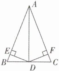 例1 如图,$AD是\triangle ABC$的中线,$DE\perp AB于点E$,$DF\perp AC于点F$,且$BE= CF$.求证:$AD是\angle BAC$的平分线.