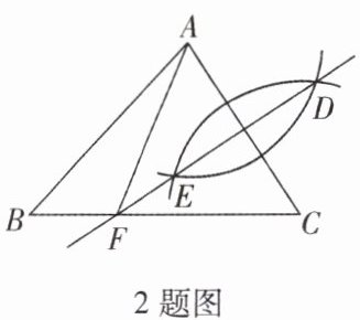 2. 如图,在 $ \triangle ABC $ 中,分别以点 $ A $,$ C $ 为圆心,大于 $ \frac{1}{2}AC $ 长为半径画弧,两弧相交于点 $ D $,$ E $,作直线 $ DE $ 与 $ BC $ 交于点 $ F $,连接 $ AF $。若 $ AB = 6 $,$ BC = 7 $,则 $ \triangle ABF $ 的周长为(