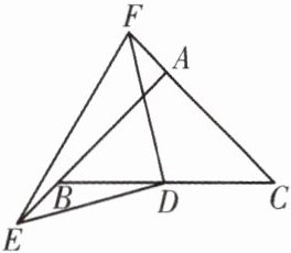 变式训练 如图,若例2中$E,F分别为AB,CA$延长线上的点,仍有$BE= AF$,其他条件不变,那么$DE与DF$具有怎样的关系? 证明你的结论.