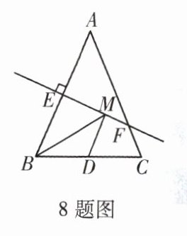 8. 如图,在△ABC中,AB = AC,BC = 4,且△ABC的面积是10,AB的垂直平分线EF分别交AB,AC边于点E,F,若点D为BC边的中点,点M为线段EF上一动点,则BM + MD的最小值为