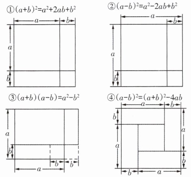 5. 我们可以利用图形中的面积关系来解释很多代数恒等式。给出以下 4 组图形及相应的代数恒等式:
