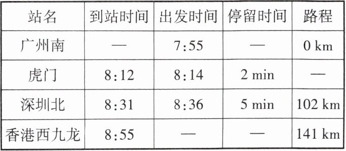 (2)广州南到深圳北:出发时间7:55,到达时间8:31,所用时间$t=36\min=0.6\,h$,路程$s=102\,km$,平均速度$v=\frac{s}{t}=\frac{102\,km}{0.6\,h}=170\,km/h$。