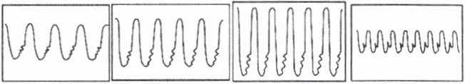 4. (203、204)编钟是我国出土的春秋战国时代的乐器,声音悦耳动听。现有四个编钟,如图所示。其中有一编钟上有一隐形的裂痕,为了查找出这口编钟,用锤子分别敲击它们,将所产生的声波输入示波器中,下列四幅图为示波器中显示的波形图。