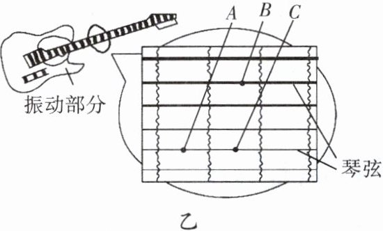 。(2)据图乙判断,在张力相同的情况下,分别按住A点、B点、C点后拨动琴弦,发出的音调最高的是按住