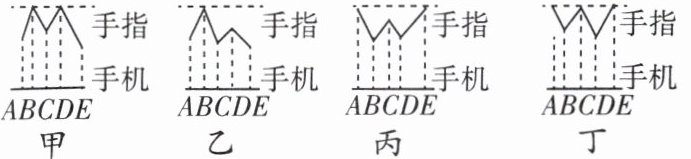 (3)放大手指局部,其表面是凸凹不平的。当手指触碰带有超声波指纹识别系统的手机,手机发出的超声波遇到手指上 A、B、C、D、E 五个位置,测得回收信号的时间分别为 0.30 ms、0.36 ms、0.30 ms、0.36 ms、0.26 ms。根据时间,求出手指与手机平面的距离,就可以绘出指纹的大致形状。则该处指纹的大致形状是图