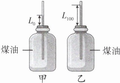(302)(物理与日常生活)小明用带橡皮塞的玻璃瓶和细玻璃管制作了一个简易的煤油温度计,在 1 个标准大气压下,将该温度计放入冰水混合物中时,上部煤油柱的长度为 $ L_0 = 4cm $,如图甲所示;将该温度计放入沸水中时,上部煤油柱的长度为 $ L_{100} = 14cm $,如图乙所示。则: