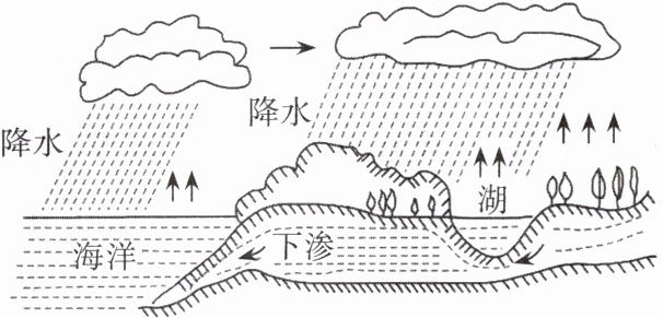 1. (304)地球表面$70\%$以上是海洋,但可供人类直接利用的淡水资源不足全部水资源的万分之一,增强节水意识是公民的义务和责任。如图是水循环示意图,下列说法正确的是(