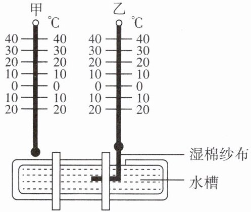 3. (304)有一种能反映空气中水蒸气含量(空气湿度)的装置,叫作干湿球温度计,如图所示。它是由甲、乙两支相同的温度计并列组成的,其中乙温度计的玻璃泡上包着湿棉纱布,甲温度计是干燥的,我们发现