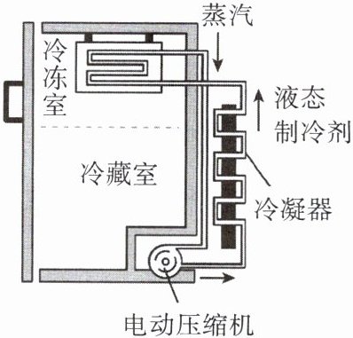 (304)(物理与科技)如图所示是电冰箱的工作原理图,液态制冷剂在电动压缩机的驱使下,在密封的管道内循环流动,达到制冷目的。